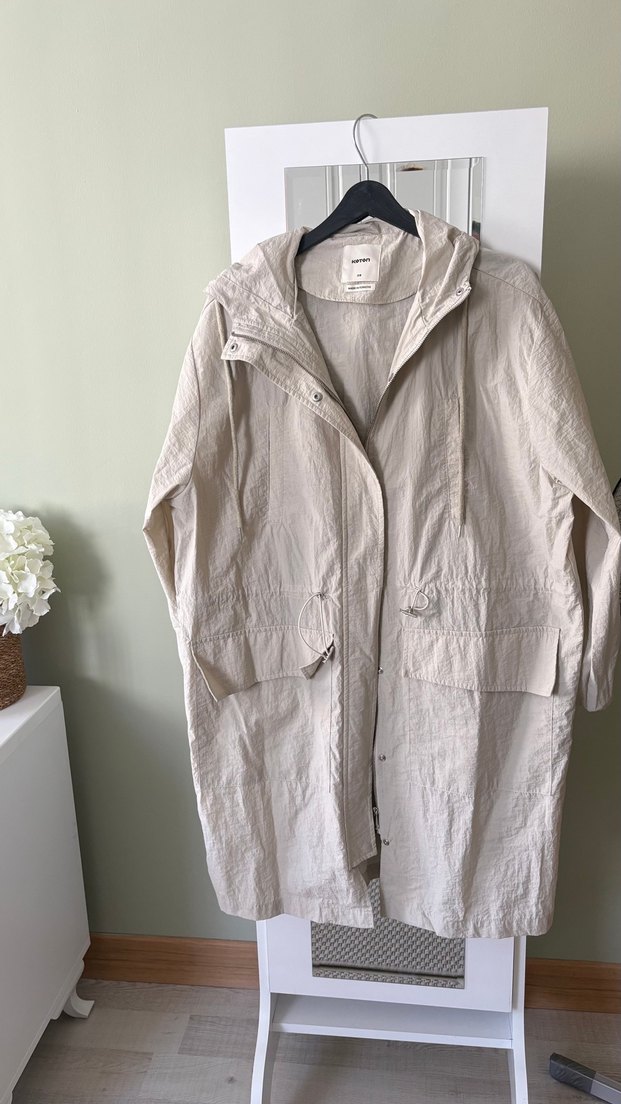 Bej renkte, keten kumaştan midi uzunlukta, bol kesim ve kesik yaka detaylı uzun kollu kadın yağmurluk. Günlük kullanıma uygun, zahmetsiz şıklık sunar. ☔ SADECE 1 KEZ KULLANILDI YENU SAYILIR DETAYLI INCELEYIN LÜTFEN İADE KESİNLİKLE YOKTUR