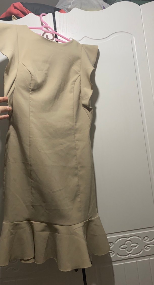 Bej renkli, midi boy keten kumaştan, kolsuz ve yuvarlak yaka ofis elbisesi. Drapeli detaylara sahip, normal kesimdir.