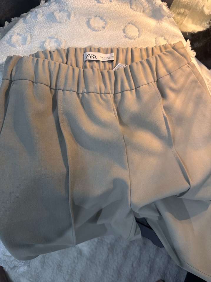 Yumuşak keten kumaştan, pilili detaylı ve lastikli bele sahip, rahat kesim bej midi pantolon. Günlük sokak stili için uygundur.