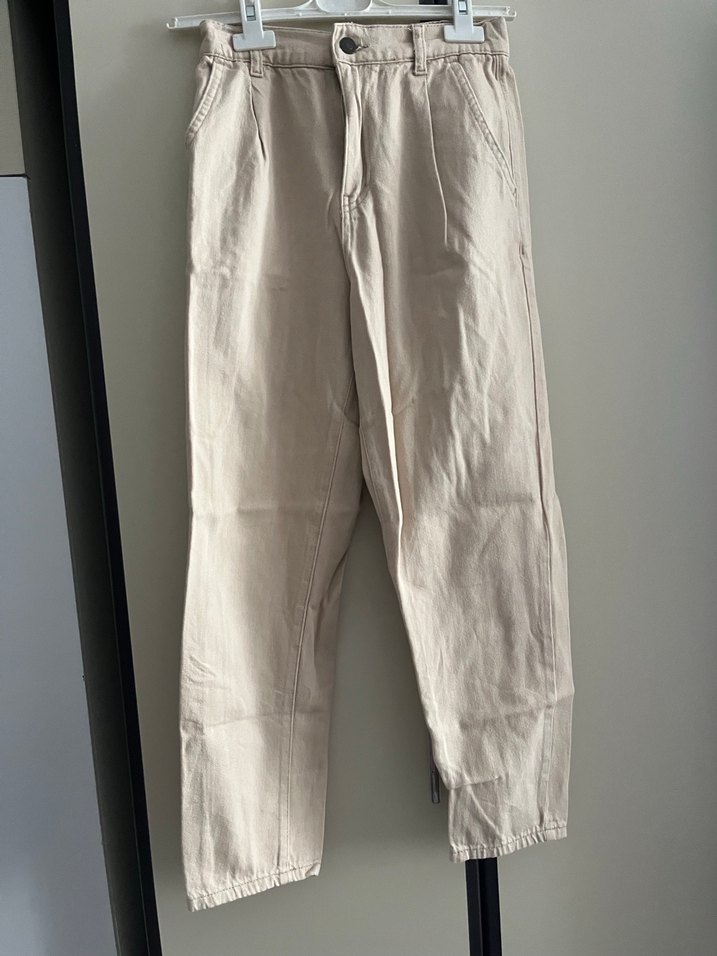 Bej renkte, keten kumaştan, midi boy ve rahat kesime sahip kadın pantolon. Minimalist ve zahmetsiz şıklık sunar, günlük kullanım için uygundur.