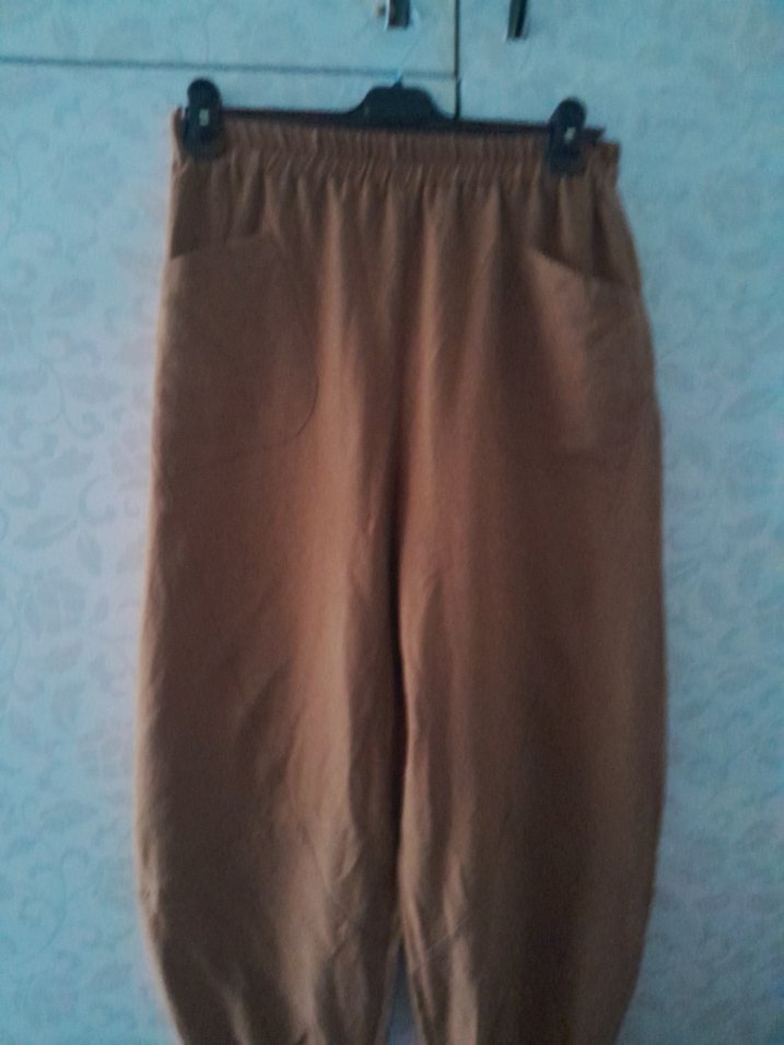 Bej renk, keten kumaştan, rahat kesim ve midi boyda, gündelik kullanıma uygun sade kadın pantolon.