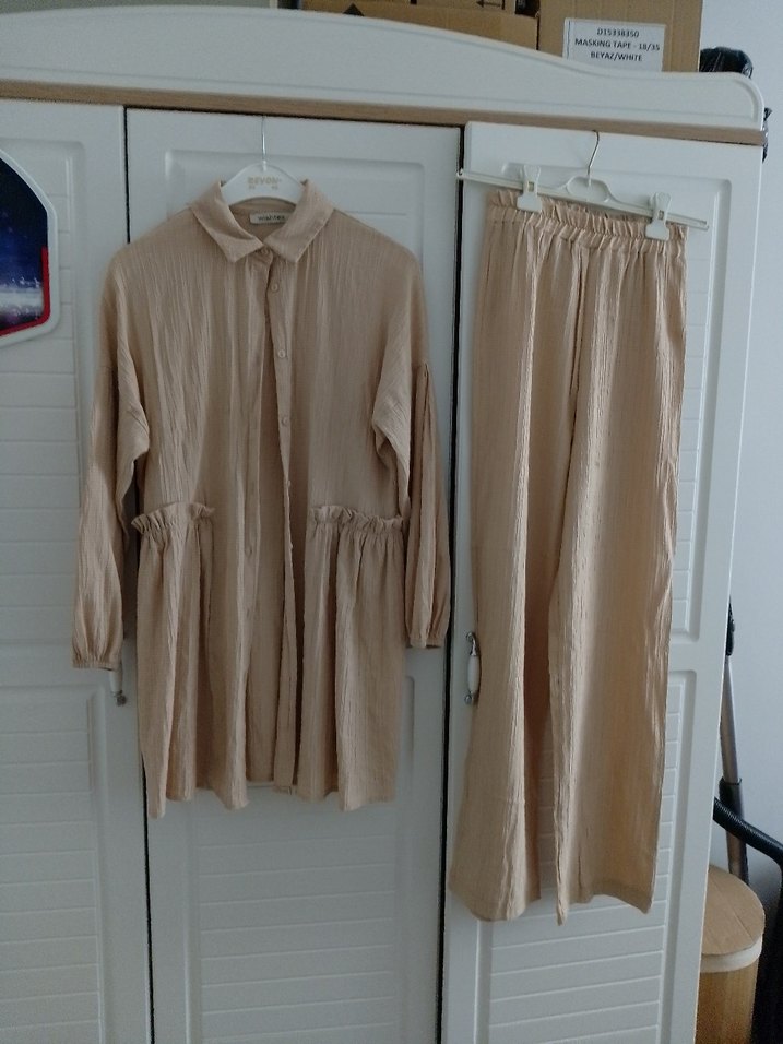 Bej renkli, keten kumaştan midi boy, rahat kesim tunik pantolon. Minimalist ve sade tarz için uygun, günlük kullanıma ideal.