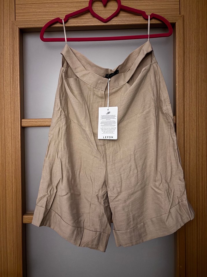 Yumuşak keten kumaştan yapılmış, düğmeli, bol kesim bej midi hamile şort. Günlük rahat stil için uygundur.