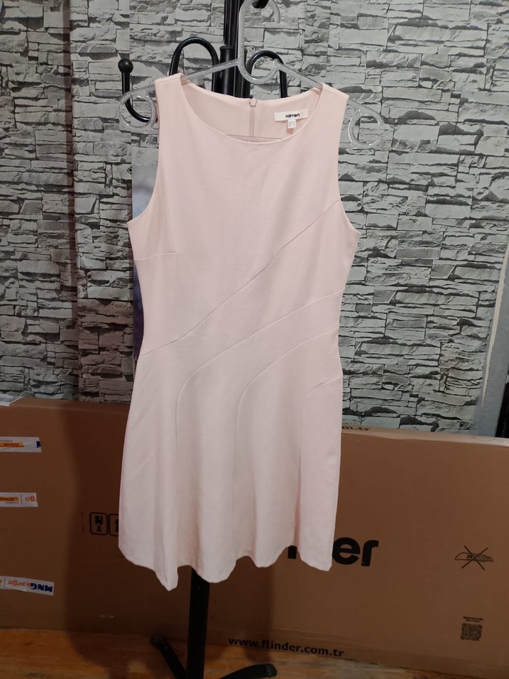 Kolsuz, bej midi elbise. İnce pile detayları ve v yaka ile sade, şık bir görünüme sahiptir. Günlük kullanıma uygundur.