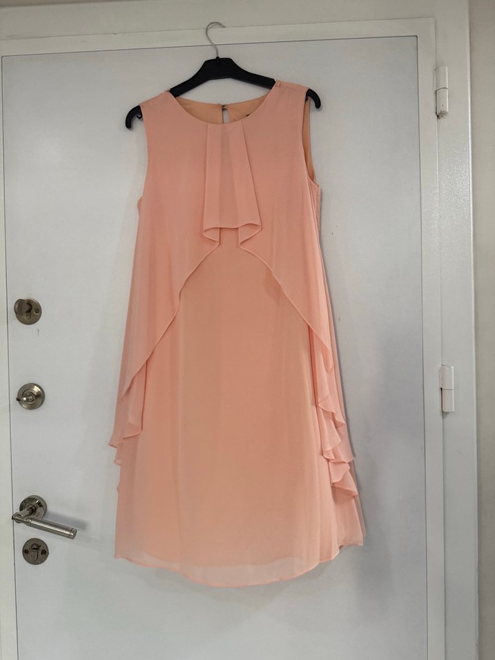 Bej renkli midi uzunlukta, kolsuz ve fırfırlı detaylara sahip, sentetik kumaştan üretilmiş bol kesim modern elbise. Günlük kullanıma uygun, minimalist ve şık tarz.