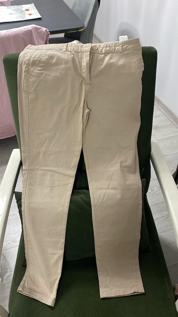 Bej renkte, midi boyda, düz kesim kadın kumaş pantolon, rahat ve şık bir günlük kullanım için uygundur. Boy 98 cm
