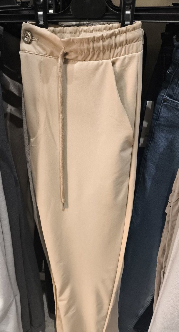 Bej renkte, midi boyda, regular fit kadın pantolon. Yumuşak sentetik kumaştan, yanında yırtmaç detayıyla günlük ve sokak stiline uygun.