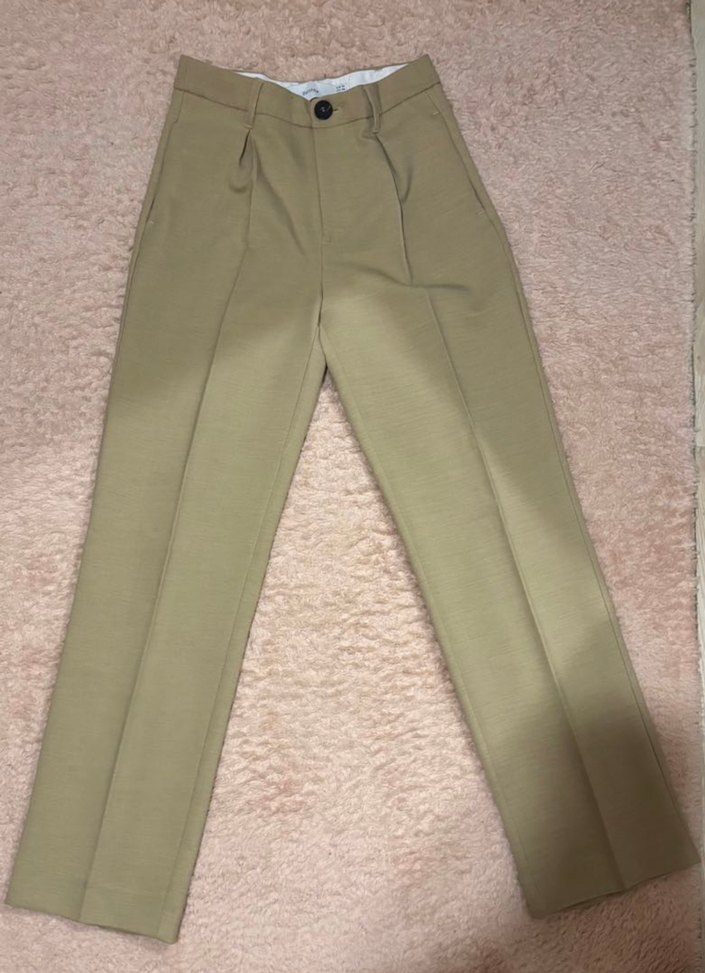 Bej renkte, normal boy midi kumaş pantolon. Düz, minimal tasarımı ve rahat kesimiyle ofis kullanımı için uygundur.