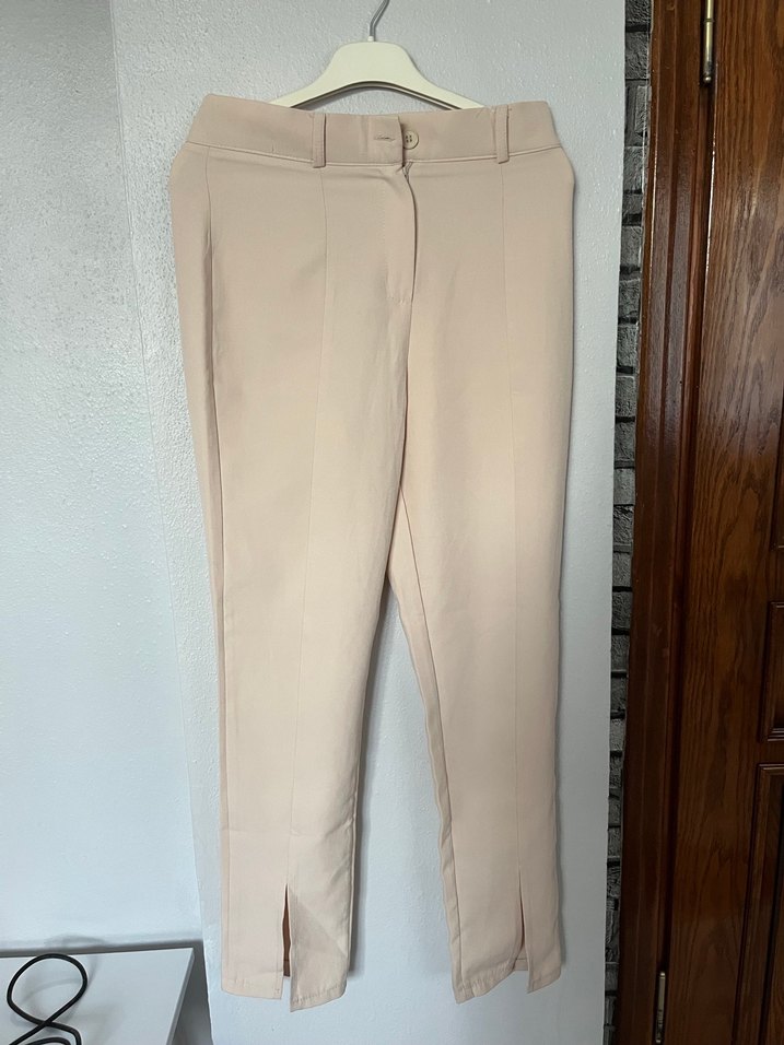 Bej midi boy, düz kesim kumaş pantolon. Yumuşak sentetik kumaştan, ön yırtmaç detaylı, ofis için şık ve trend görünümlü.