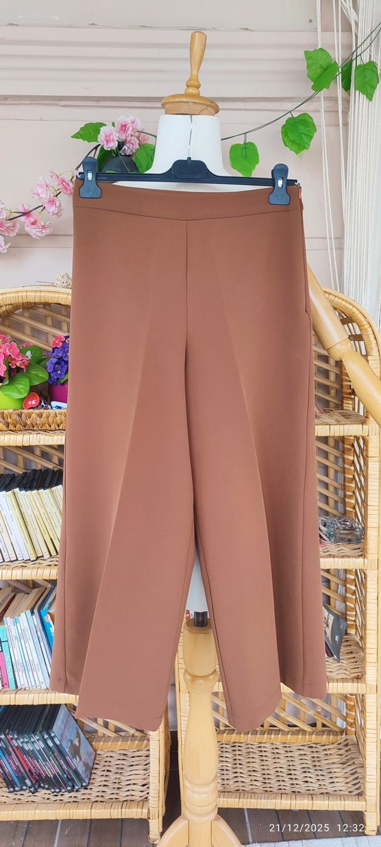 Bej midi uzunlukta, düz ve rahat kesim kadın pantolon, ofis ve günlük sokak stili için uygun, şık ve rahat bir görünüm sunar.