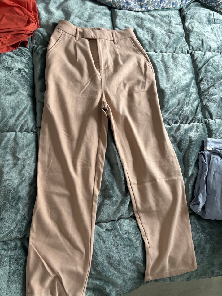 Bej midi boy, düz desenli kadın pantolon. Yumuşak sentetik kumaştan, rahat kesim. Günlük ve sokak stiline uygun şık bir parça.