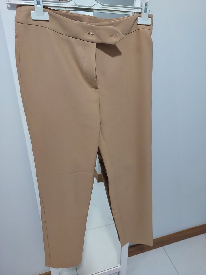 Bej midi boy, regular kesim kadın pantolon. Belde kemer detaylı, yumuşak sentetik kumaştan üretilmiş. Ofis ve sokak stiline uygun.