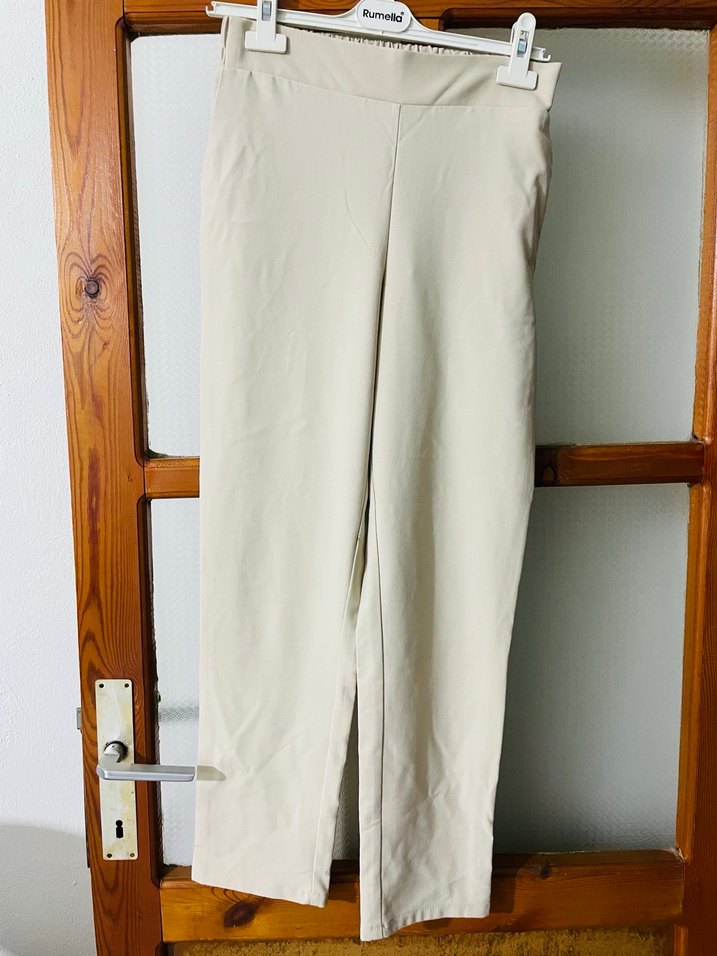 Bej renk, midi boy, düz kesim kadın pantolon. Yumuşak sentetik kumaştan yapılmış, minimal ve sade tasarımıyla ofis için uygun şık bir parça. ✨