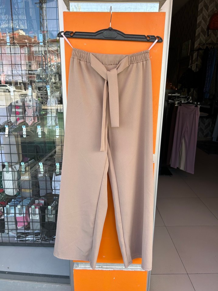 Bej renkte, belden kemerli, bol paça kadın kumaş pantolon. Rahat kesimi ve günlük kullanıma uygun yapısıyla dikkat çeker. Yumuşak sentetik kumaştan üretilmiştir.