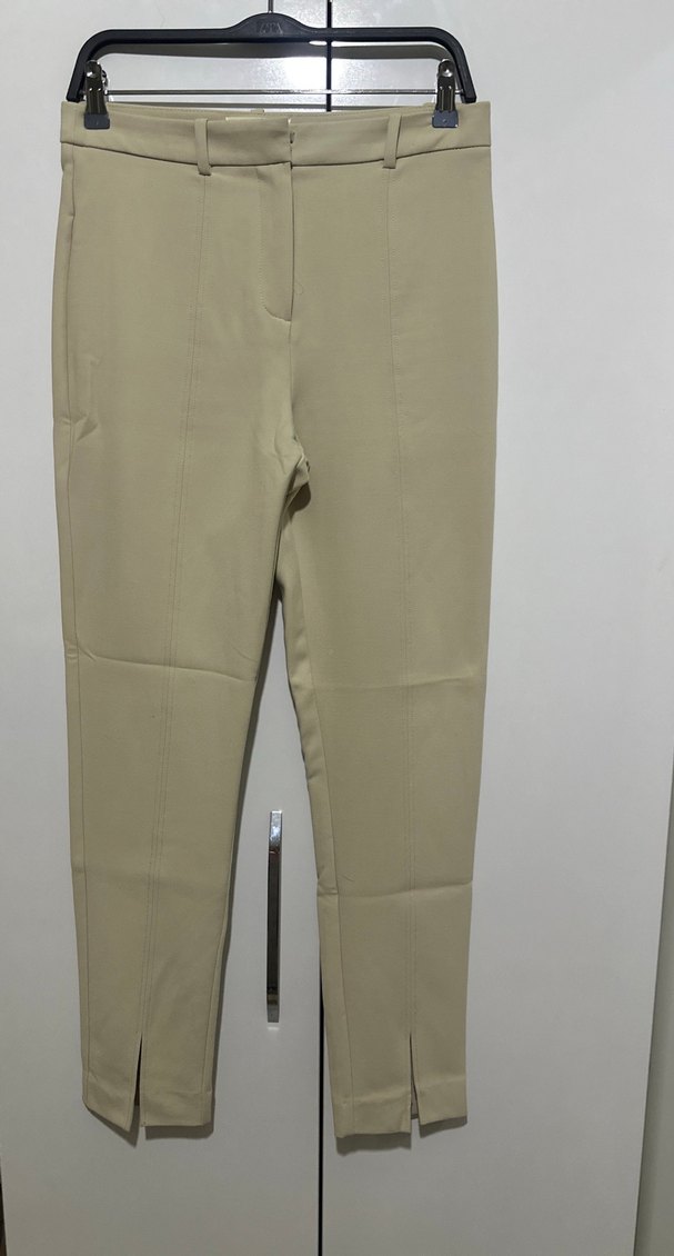 Bej midi boy kadın pantolon, düz ve yumuşak sentetik kumaştan, rahat kesim ve ön kısımda küçük yırtmaçlarla ofis için uygun şık tasarım.