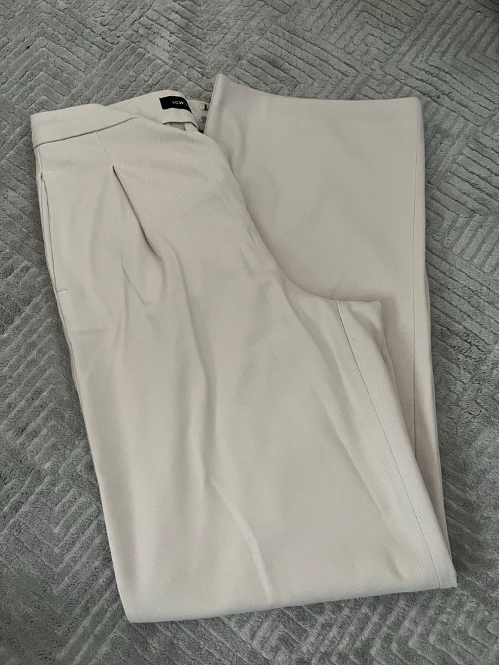 İstediğiniz ürünü ilan açabilirim Düz bej midi uzunlukta, sentetik kumaştan kadın pantolon, rahat kesimiyle ofis için şık ve sade bir görünüm sunar.