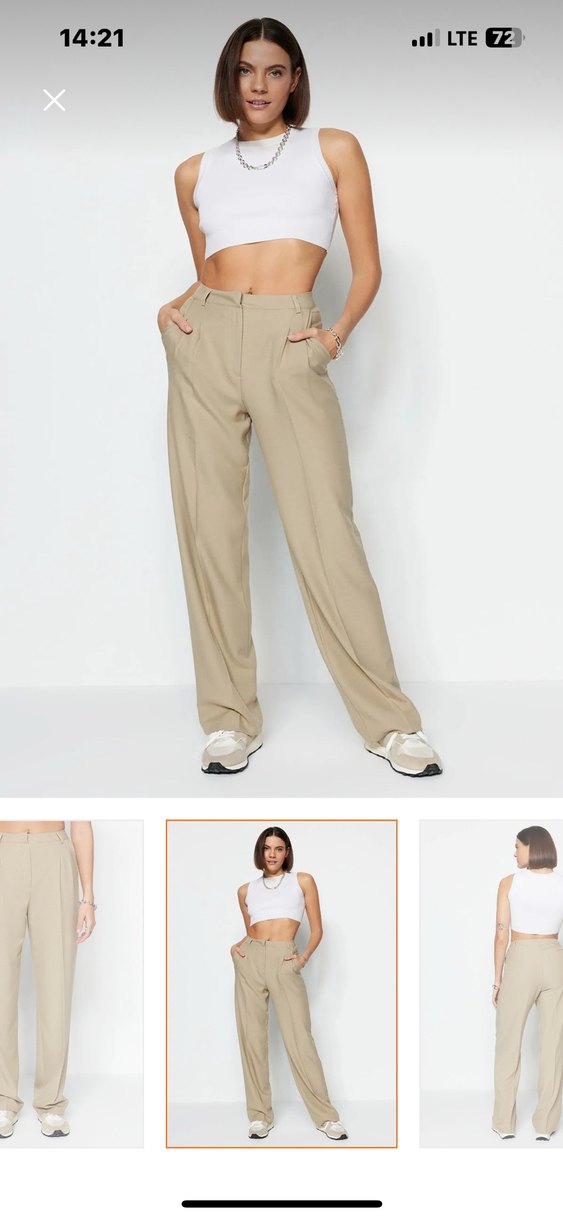 Bej renkli, normal boy midi kumaş pantolon, regular fit kesim ve hafif sentetik kumaş ile rahat bir şıklık sunar. Ofis ve günlük kullanıma uygundur. 1 kez giydim kalıbı biraz büyük 34 bedenini almak için satıyorum.