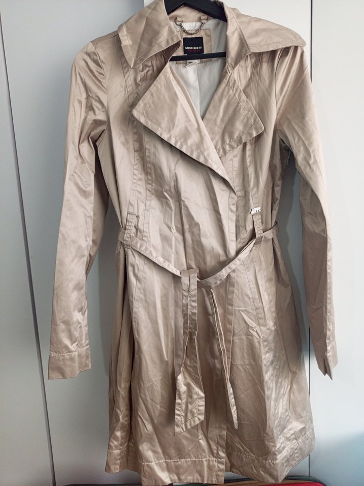 Bej renkli, kuşaklı ve normal boy midi trençkot. İpek gibi kumaştan, uzun kollu ve kesimi vücuda oturan bu model, desen içermeyen şık bir tasarıma sahiptir.