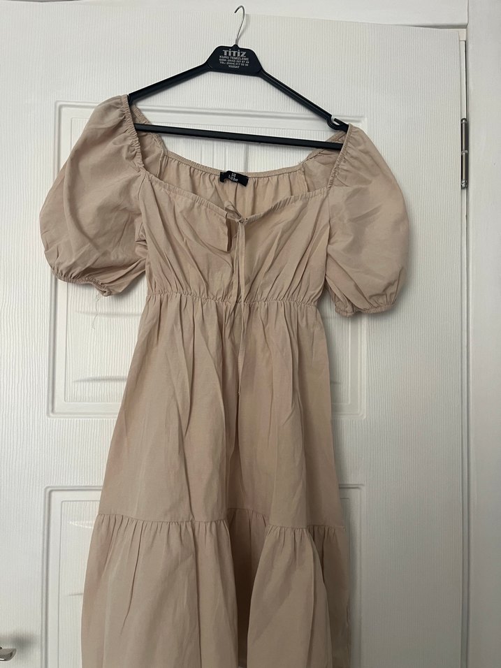 Bej renk, V yakalı ve düğmeli midi elbise. Hafif keten kumaştan, askılı kolları ve bohem tarzı ile rahat bir görünüm sunar.