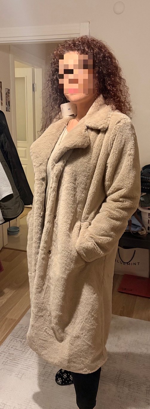 Peluş kumaştan yapılmış, bej renkli, kürk detaylı, normal uzunlukta ve geniş kesim kadın kaban. Uzun kollu ve yakası kesik detaylıdır. Sokak stiliyle günlük kullanıma uygundur.
