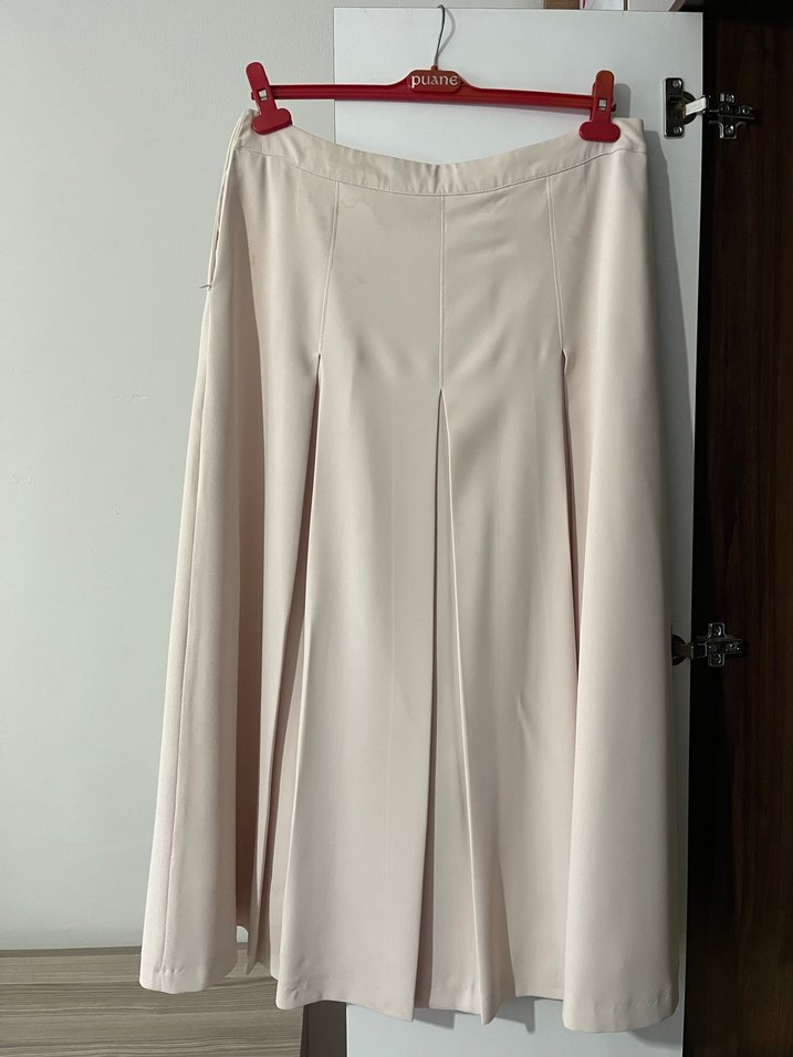 Bej renkte, pilili ve normal kesime sahip midi uzunlukta kadın eteği. Yumuşak sentetik kumaştan üretilmiş, klasik ve Paris tarzı normcore şıklık sunar.