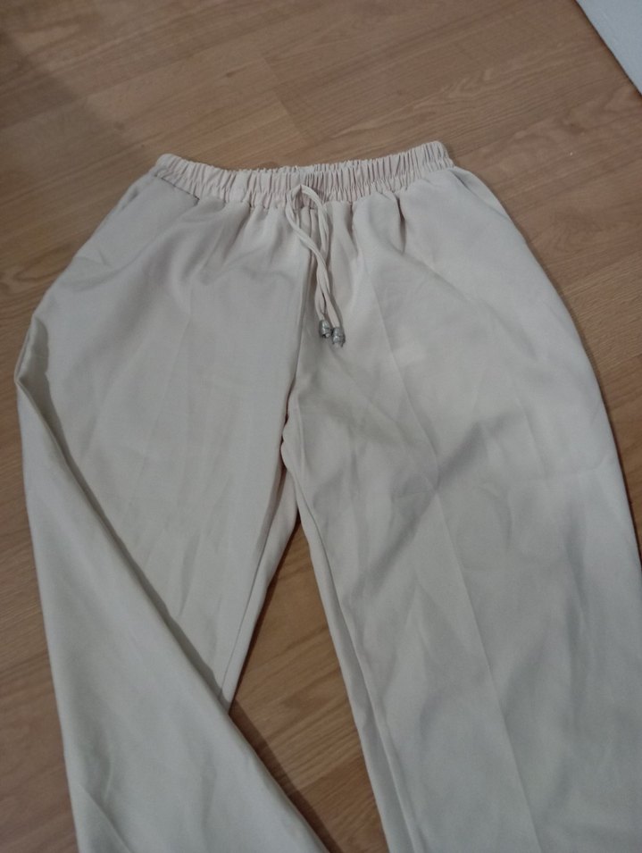 Bej renkli, midi boy, bol kesim keten pantolon, elastik bel detaylı, minimal ve rahat bir günlük stil için uygun.