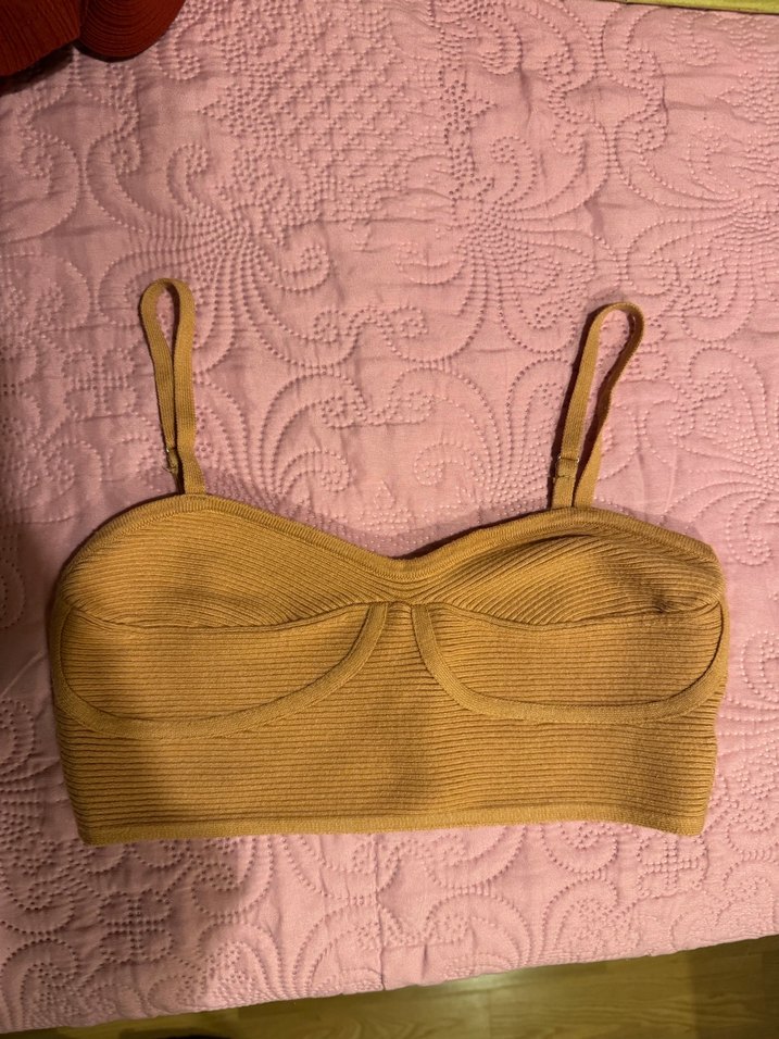 Ayarlanabilir askılı, bej renkli ribanalı midi bralet. Rahat ve sokak stiline uygun tasarım.