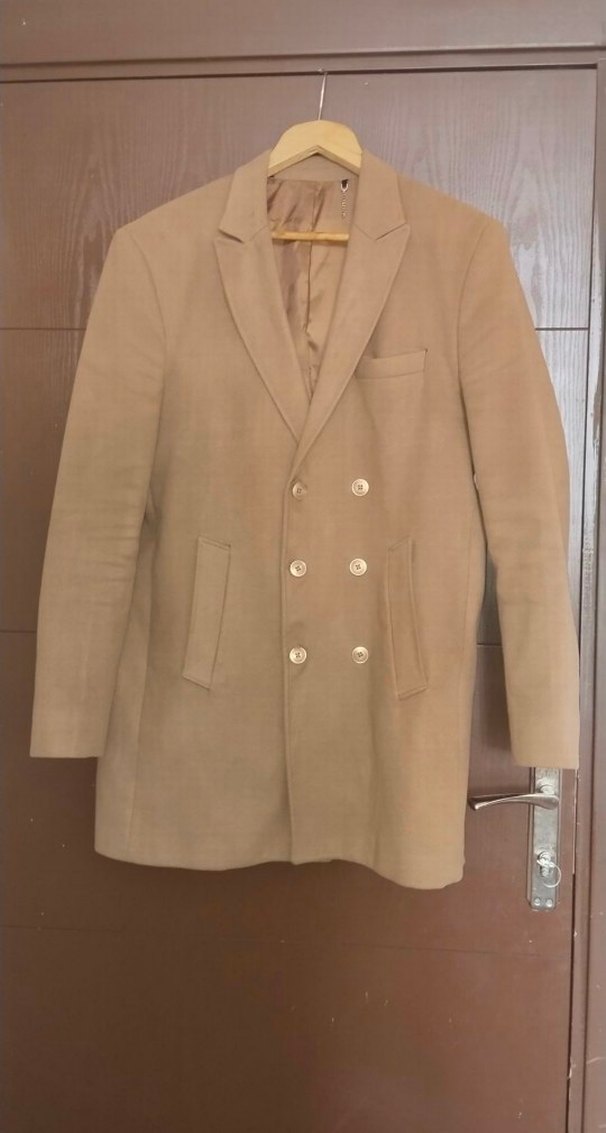 Bej renkte, düğmeli, notched lapel yakalı midi uzunlukta süet erkek kaban. Uzun kollu ve normal kesim olan bu kaban, minimal ve desensiz tasarıma sahiptir. Ofis kullanımı için uygundur.