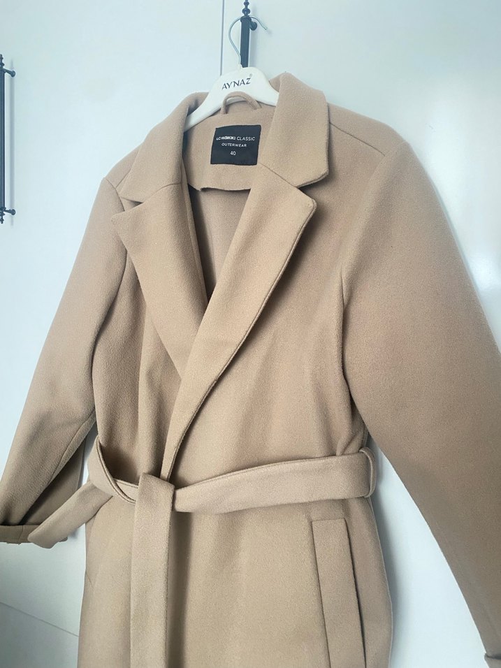 Bej renkli, süet kumaştan midi uzunlukta kadın kaban. Notlu yaka ve kemerli tasarımıyla şık, minimalist ve rahat bir görünüm sunar. Ofis için uygundur.