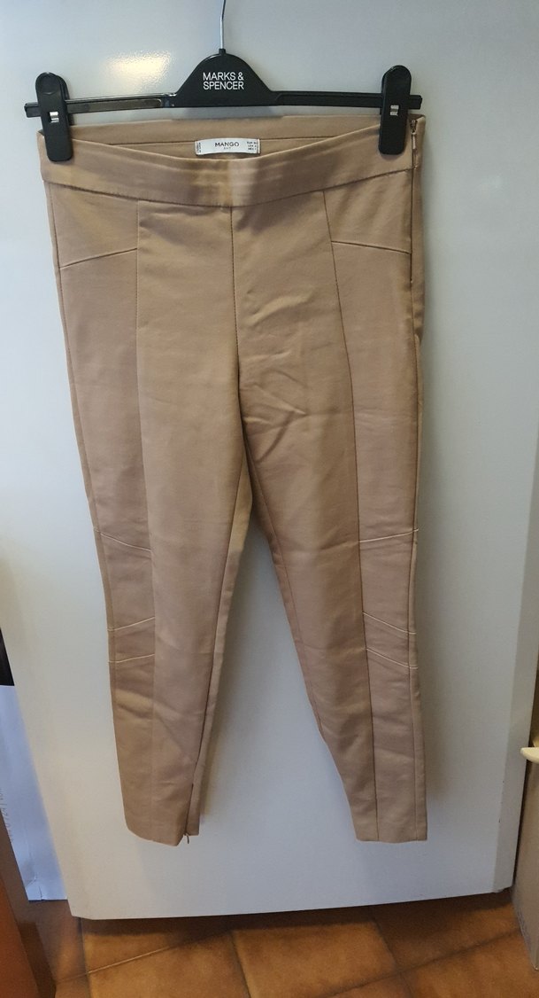 Bej renkli, midi boy, yumuşak süet kumaştan üretilmiş kadın pantolon. Regular fit kesim ve fermuarlı detaylara sahiptir, günlük ve ofis kullanımına uygundur.