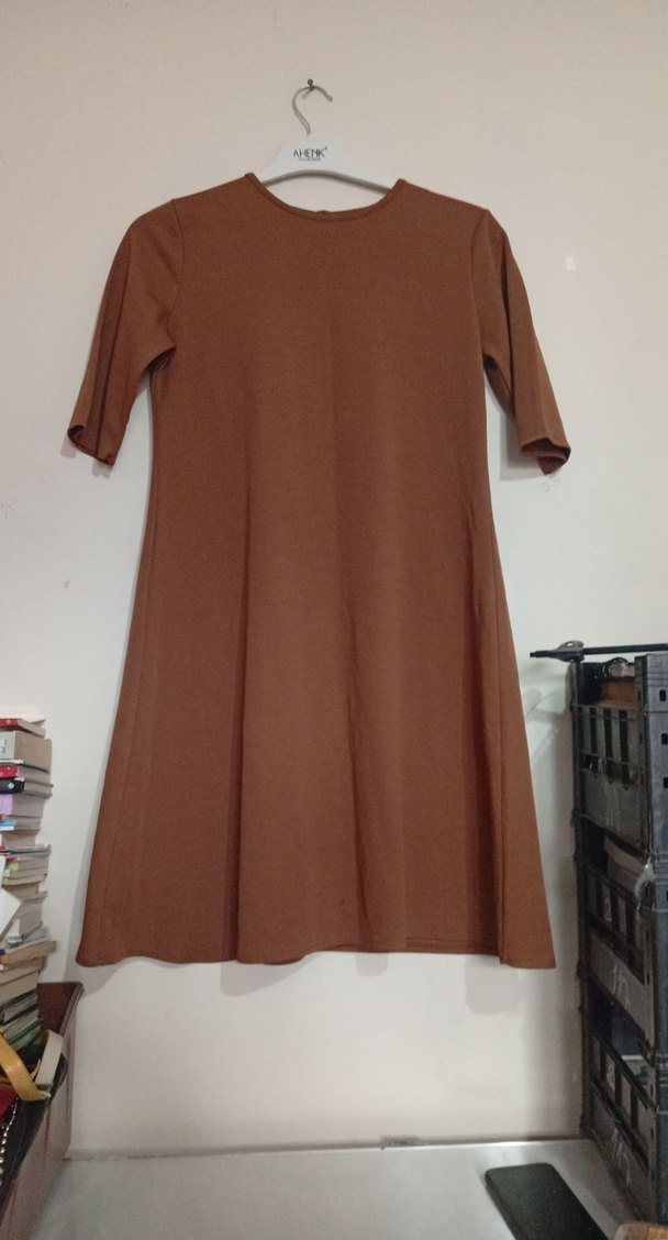 Bej renkte, kısa kollu, yuvarlak yakalı, rahat kesim midi triko elbise, yumuşak sentetik kumaştan üretilmiştir.
