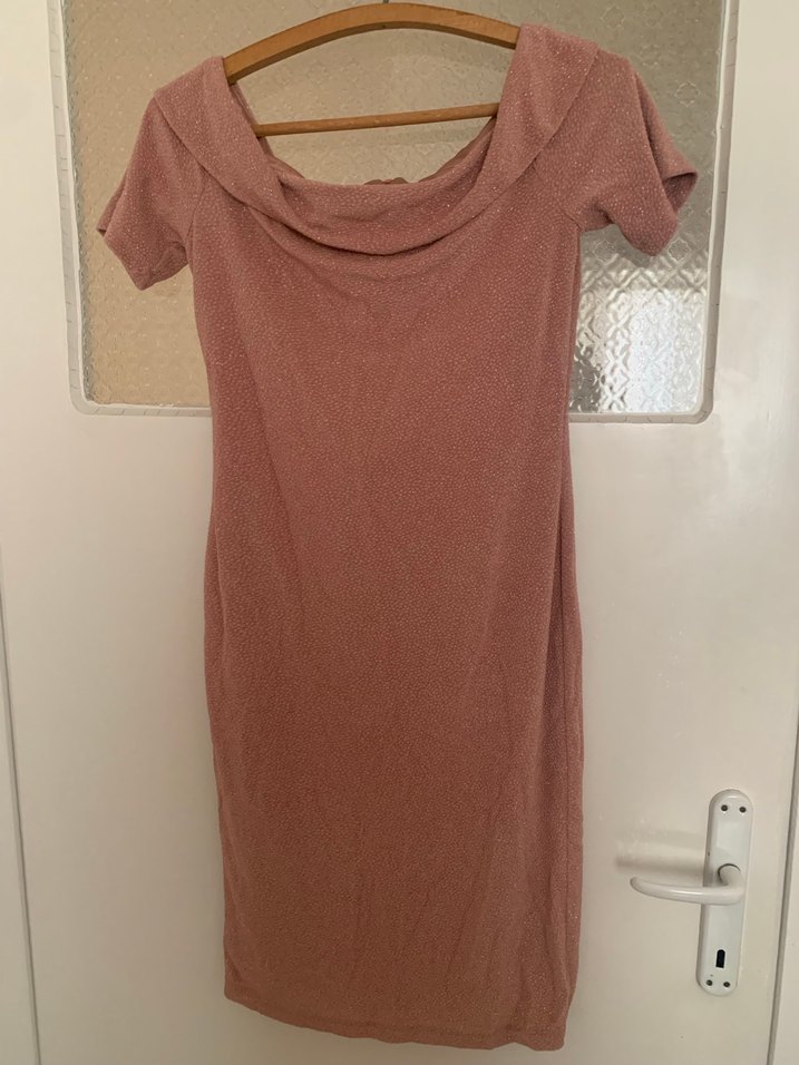 Bej midi boy, kısa kollu triko elbise, drapeli sandal yaka ve yumuşak keten kumaştan, sade ve şık sokak tarzı için uygun.