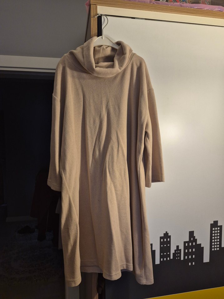 Bej midi uzunlukta, yüksek yakalı ve uzun kollu, bol kesim triko elbise. Yumuşak ve sıcak dokusu ile rahat, günlük kullanıma uygun bir tasarıma sahiptir. Çok az kullandım, bir yerinde bir şey yok.