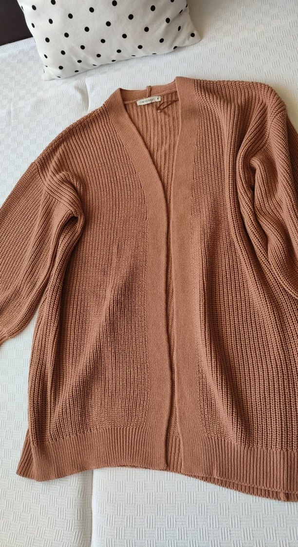 açık kahverengi renkte, uzun kollu triko hırka. Rahat kesimi ve yumuşak dokusuyla günlük kullanıma uygundur. koltuk arası 58 cm boy uzunluğu 82 cm