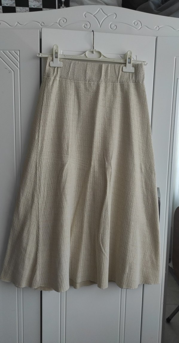 Bej renkli, örme kumaştan yapılmış, bol kesim midi uzunluğunda kadın eteği. Minimalist ve bohem tarzlara uygun, günlük kullanıma ideal. Etek boyu 80 cm dir