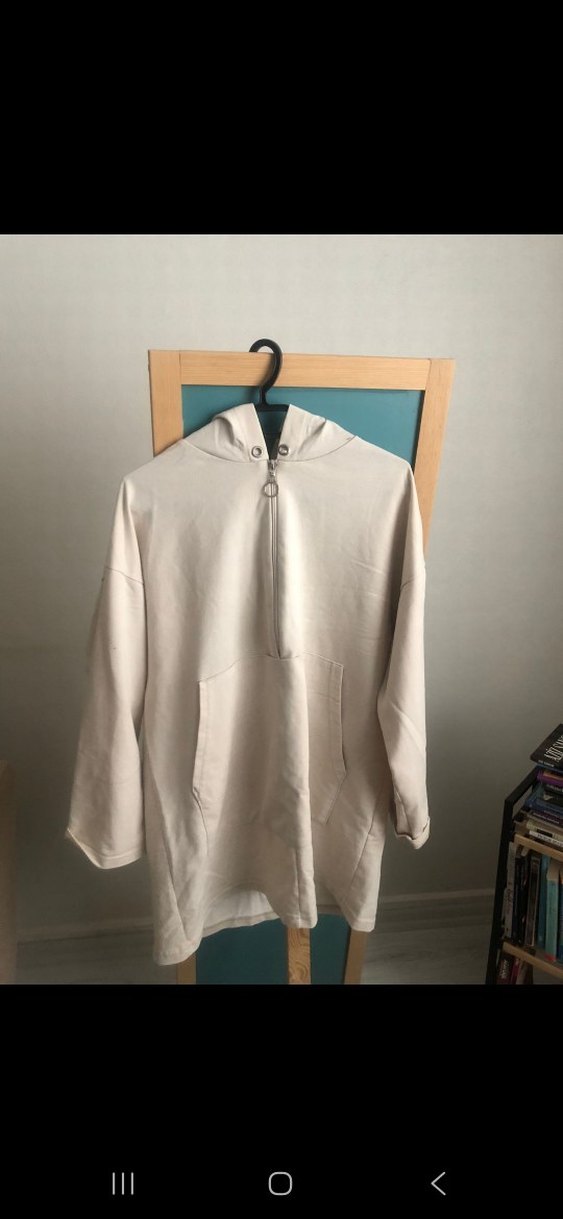 Bej midi uzunlukta, uzun kollu ve fermuarlı ön kısmı olan sweatshirt. Rahat kesimi ve yumuşak dokusuyla günlük sokak stili için uygundur.