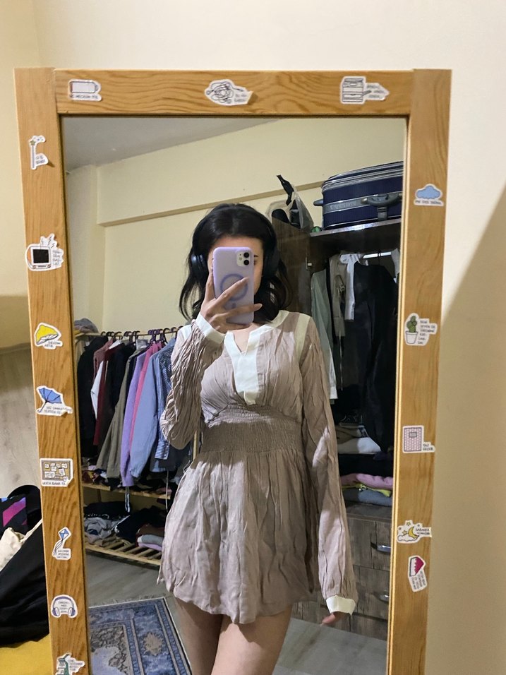 Pastel bej renkte, uzun kollu ve V yakalı midi elbise. İpeksi kumaştan, salaş kesim ve tie-dye desenli, şeffaf detaylar içerir. Günlük rahat kullanım için uygun.
