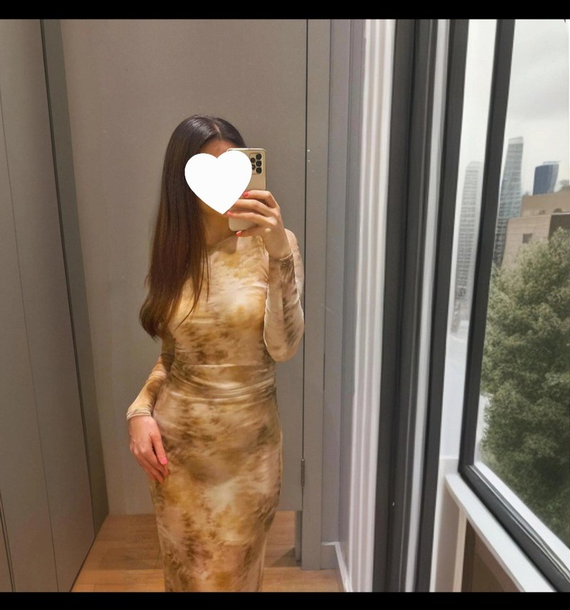 Yüksek yakalı, uzun kollu ve transparan detaylı, bej tonlarında tie-dye desenli, ipeksi kumaştan yapılmış, vücuda oturan midi elbise.