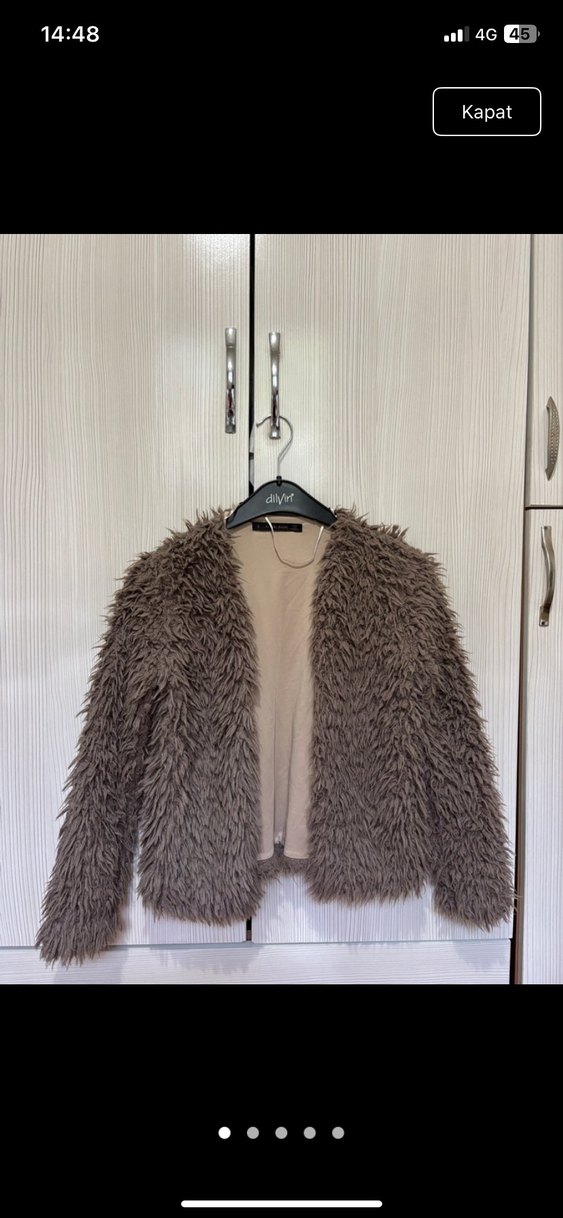 Bej renkli, kürk detaylı, midi uzunlukta ve uzun kollu kadın mont, yumuşak yün kumaştan, sokak stiline uygun şık kesimle.