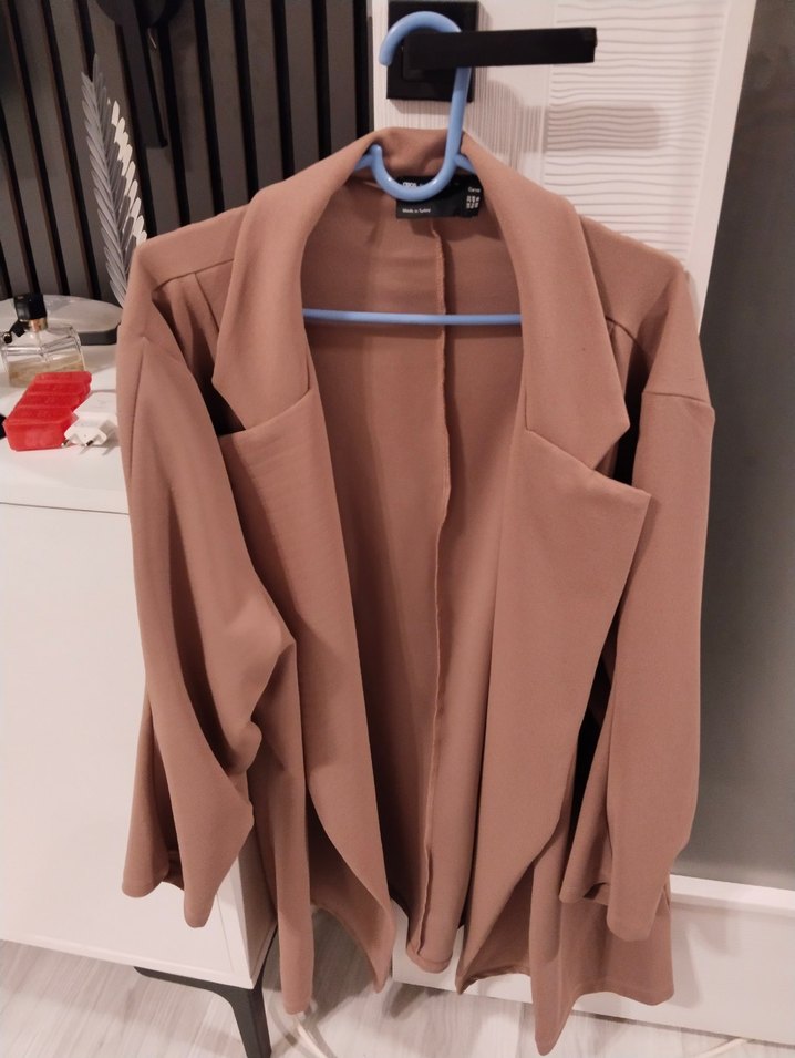 Bej renkte, notalı yaka ve salaş kesime sahip hamile ceketi. İpek gibi yumuşak kumaştan, midi boy ve uzun kollu, ofis için uygun pastel tonlarda. 40 42 44 46bedenlere uygundur