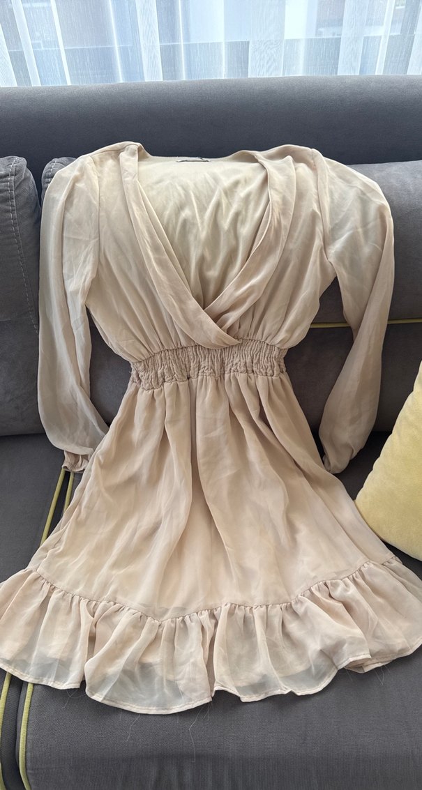Bej renkli keten elbise, drapeli V yakalı ve bol kesimdir. Uzun kollu, midi boy ve yumuşak kumaşıyla rahat bir şıklık sunar.
