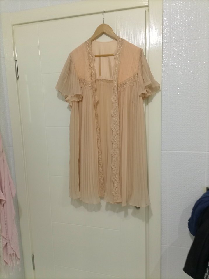Bej renkte, kısa kollu, midi boyda, vintage bohem tarzında, dantel detaylı ve bol kesim kadın sabahlık. Yumuşak pastel tonlarda, desensiz kumaş.Somon renktir