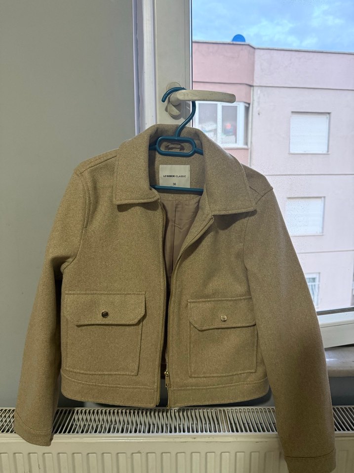 Bej renkli yün kaban, notched lapel yakalı ve düğmeli önüyle, günlük kullanıma uygun rahat kesim ve uzun kolludur.