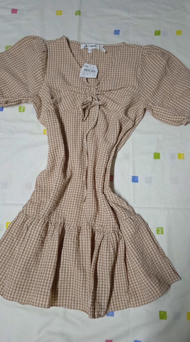 Bej mini boy, kısa balon kollu, v yakalı, bol kesim ve volan detaylı, yumuşak sentetik kumaştan günlük elbise.