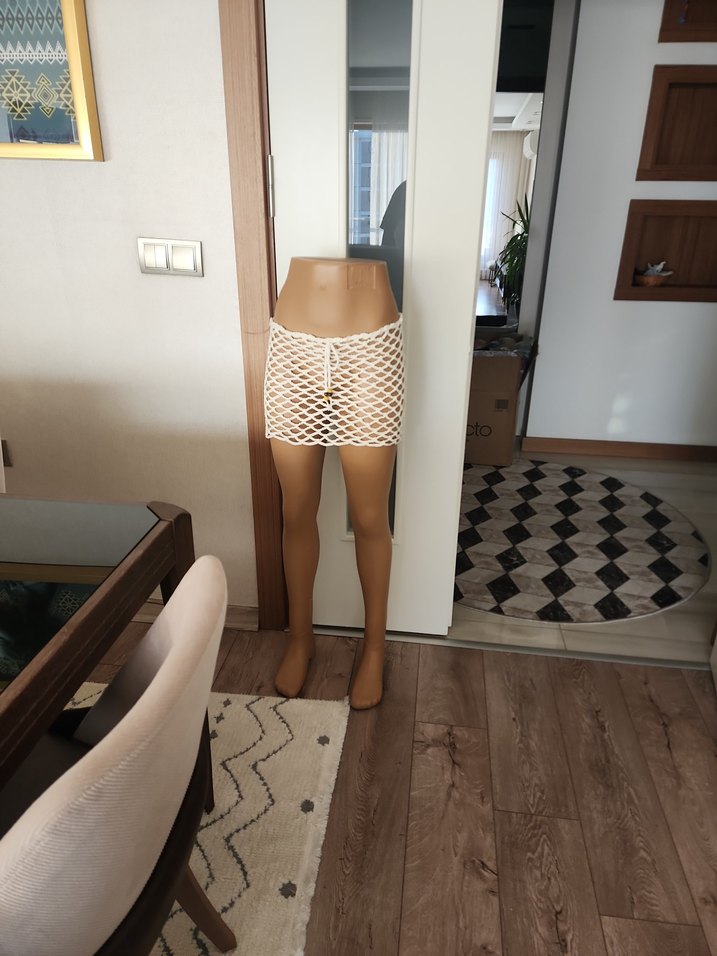 Bej renkte, dantel detaylı ve ince askılı, yılan desenli mini pareo. Rahat ev kullanımı için uygundur.