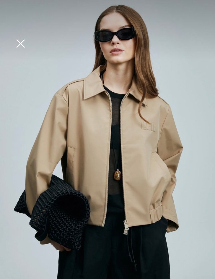 Bej mini deri kadın ceket, bol kesim ve uzun kollu, yaka kısmı kesik detaylı, günlük kullanıma uygun rahat şık bir tasarım.