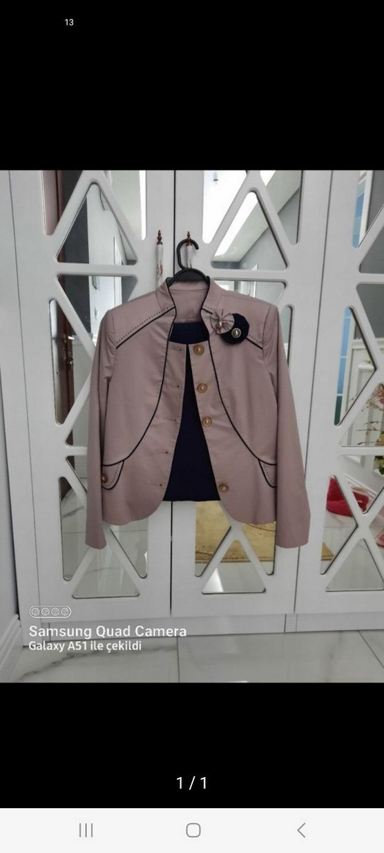 Bej, kısa kesim, düğmeli kadın blazer. Notlu yaka ve uzun kollu, baskılı sentetik kumaştan ofis için uygun, Paris sokak stili esintili. etekli takımdır kullanışlıdır.1 kez kullanılmıştır.