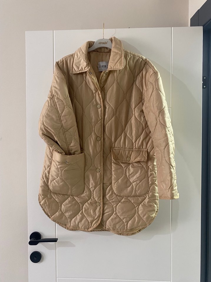 Bej renkte, kısa boylu kadın ceketi rahat kesim ve uzun kolludur. Yumuşak keten kumaştan, düğmeli ve kesik yakalıdır, günlük sokak stili için uygundur.