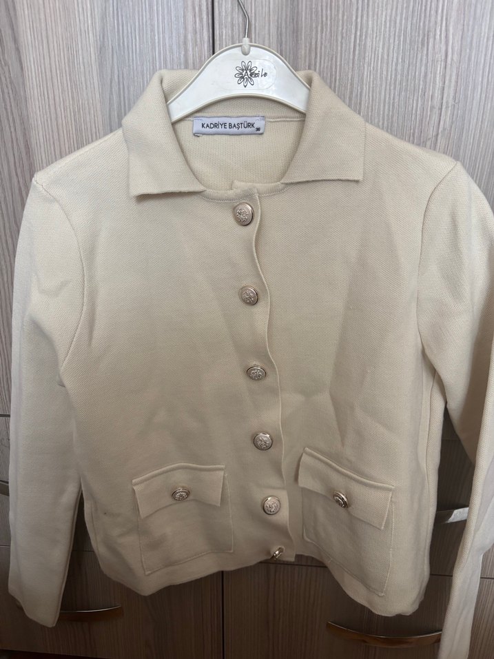 Bej renkli, düğmeli, mini uzunlukta kadın hırka. Notch yaka ve uzun kollu, sentetik kumaştan yapılmıştır. Modern klasik tarzda, rahat kesim.