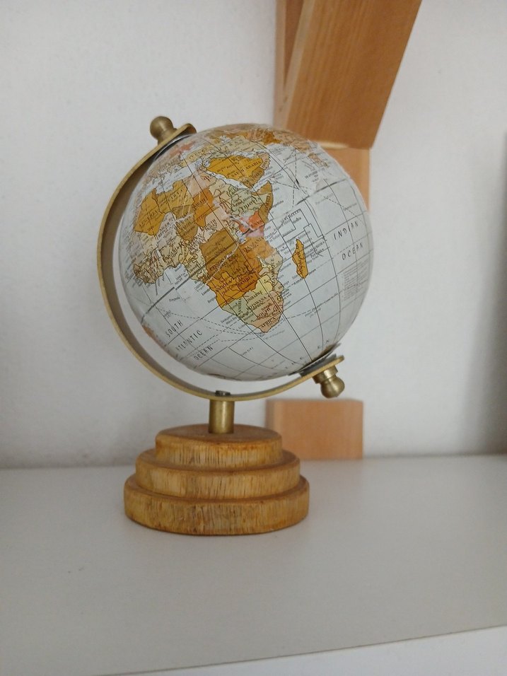 Ahşap tabanlı, vintage dünya haritası desenli küçük bej renkli mini dünya figürü. Cocuklar kagidini yirtti geri yapistirdim. fotograflarda belli ona göre aliniz